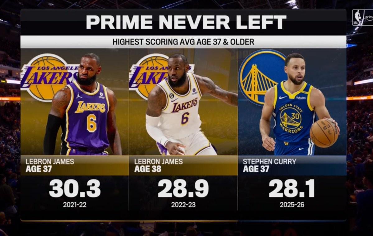 北京时间今日,湖人队和勇士队都在常规赛比赛日中迎来比赛,最终湖人不敌黄蜂,勇士力克尼克斯。在直播期间,比赛转播方晒出了两队球星詹姆斯和库里的场均得分数据进行对比。目前37岁的库里本赛季场均得分位28.1分,作为对比,37岁的詹姆斯在2021-22赛季场均能得到30.3分,而老了一岁的他在2022-23赛季还能得到28.9分,高于库里本赛季至今的场均得分。在今...